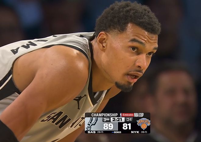 随着比赛的进行,两队分差接近,文班亚马受到伤病以及尼克斯球员的盯防存在感不高。上半场结束,马刺61-59尼克斯,文班仅得到4分,反击背扣没进,尼克斯的阿奴诺比拿下20分。