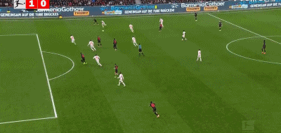 易边再战勒沃库森继续加强进攻,开场仅1分钟,勒沃库森中路快速反击就制造杀机,蒂尔曼断球高速往前推进,一路突入禁区获得超级单刀机会,然而蒂尔曼大力推射竟然踢飞了。第64分钟,勒沃库森右路快攻,亚瑟突到禁区边上兜传门前,刚刚替补登场的泰里耶小禁区前沿一记巧妙的蝎子摆尾打门,皮球越过门将坠入球门右下死角,勒沃库森1:0打破僵局。